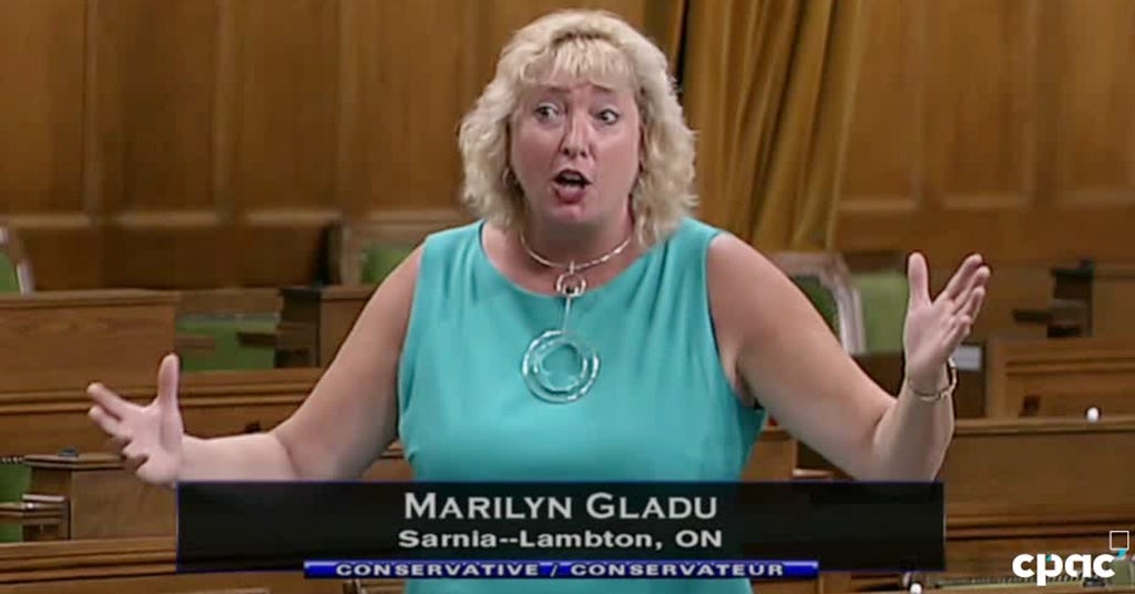 Yet those are the positions of record for Marilyn Gladu, now a Liberal MP, who until five minutes ago was one of the bluest of Tories. In 2020 she ran for the leadership of the party, for crying out loud; and she was elected four times as a Conservative in her riding of Sarnia-Lambton-Bkejwanong, which she’s held since 2015, and which has been in Tory hands for the last twenty years.